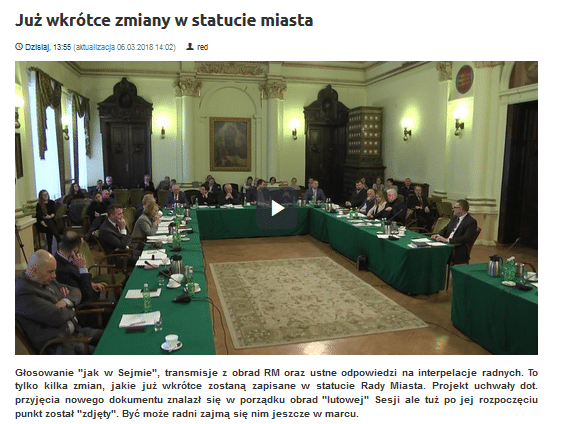 NASZA TELEWIZJA SĄDECKA „Głosowanie „jak w Sejmie”, transmisje z obrad RM oraz ustne odpowiedzi na interpelacje radnych. To tylko kilka zmian, jakie już wkrótce zostaną zapisane w statucie Rady Miasta. Projekt uchwały dot. przyjęcia nowego dokumentu znalazł się w porządku obrad „lutowej” Sesji ale tuż po jej rozpoczęciu punkt został „zdjęty”. Być może radni zajmą się nim jeszcze w marcu”. http://www.ntvsadecka.pl/wiadomosci/1476,juz-wkrotce-zmiany-w-statucie-miasta