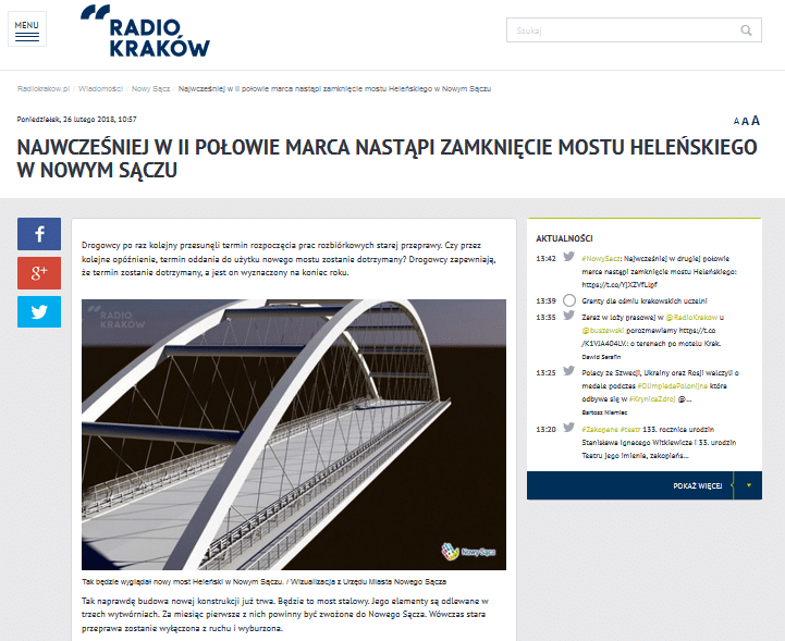 RADIO KRAKÓW „Najwcześniej w II połowie marca nastąpi zamknięcie mostu Heleńskiego w Nowym Sączu. Drogowcy po raz kolejny przesunęli termin rozpoczęcia prac rozbiórkowych starej przeprawy. Czy przez kolejne opóźnienie, termin oddania do użytku nowego mostu zostanie dotrzymany? Drogowcy zapewniają, że termin zostanie dotrzymany, a jest on wyznaczony na koniec roku”. http://www.radiokrakow.pl/wiadomosci/nowy-sacz/najwczesniej-w-ii-polowie-marca-nastapi-zamkniecie-mostu-helenskiego-w-nowym-saczu/