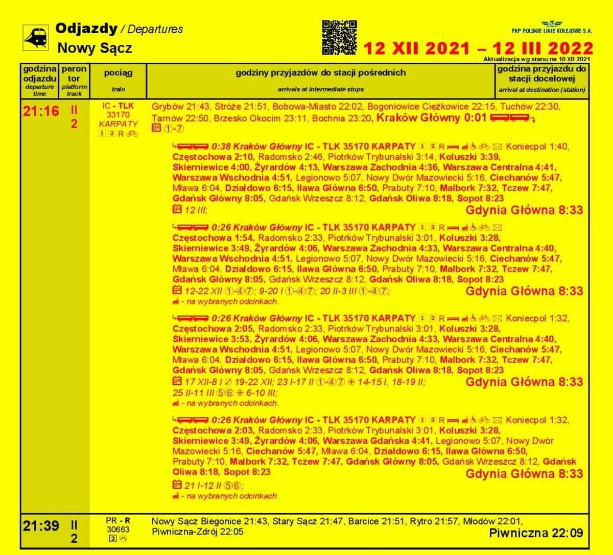 Informacje na temat aktualnego rozkładu jazdy pociągów są dostępne na stacjach i przystankach, w internecie na portalpasazera.pl, rozkład-pkp.pl oraz w aplikacjach mobilnych Portal Pasażera i Rozkład-PKP. Na stacjach i przystankach informacje o odjazdach i przyjazdach pociągów wyświetlane także na tablicach elektronicznych oraz przekazywane są podróżnym w formie komunikatów głosowych.