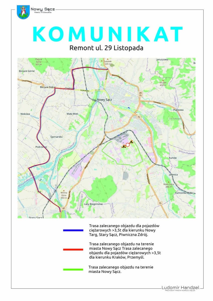 Objazd dla pojazdów o dopuszczalnej masie całkowitej do 3,5 tony wyznaczono ulicami Nawojowską, Grunwaldzką i Zieloną. Dojazd do osiedla Błonie możliwy będzie tylko od strony ul. Kusocińskiego. Informacje o objazdach i mapka poniżej, na materiałach przygotowanych przez Urząd Miasta Nowego Sącza.