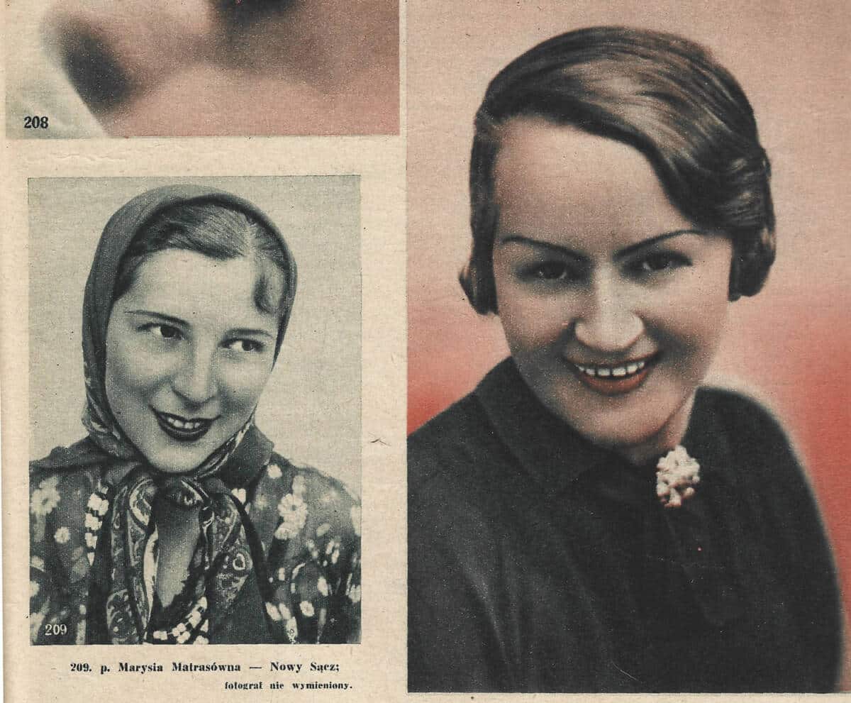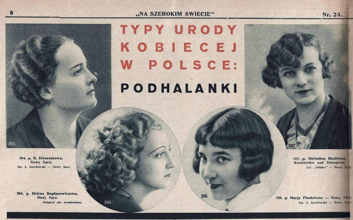 Seria zdjęć nadesłanych na konkurs „Typy urody kobiecej w Polsce” prowadzony przez tygodnik Na Szerokim Świecie i opublikowanych w numerze 24 (300) tego czasopisma w czerwcu 1934 roku. „W dzisiejszym numerze robimy próbę „regjonalną” naszego konkursu: zamieszczamy same zdjęcia Podhalanek, nadesłane nam z Nowego Targu, Nowego Sącza, poza tem po jednej ze Starego Sącza i z Krościenka nad Dunajcem – wszystko w obrębie tej samej podgórskiej okolicy, między Pieninami i Tatrami” – wyjaśnia redakcja.