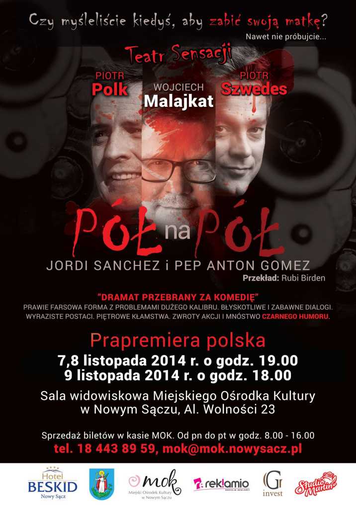 W sali widowiskowej nowosądeckiego Miejskiego Ośrodka Kultury odbędzie się polska prapremiera hiszpańskiej sztuki „Pół na Pół”. Przedstawienie wyreżyserował Wojciech Malajkat a w obsadzie są Piotr Polk i Piotr Szwedes.