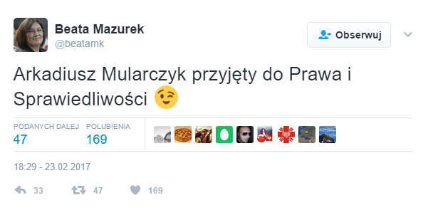 O przyjęciu Mularczyka z powrotem w szeregi PiS poinformowała w czwartek na Twitterze rzeczniczka tej partii, Beata Mazurek.