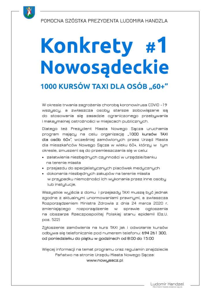 Aby wspomóc seniorów ale również sądeckich taksówkarzy, prezydent proponuje bezpłatne dla osób powyżej 60. roku życia kursy po mieście w celu załatwienia istotnych spraw. Kursy, które muszą być zamawiane co najmniej dzień wcześniej, mogą odbywać się od poniedziałku do piątku, między godz. 7:00 a 16:00 i po spełnieniu jeszcze kilku wymogów (zasady znajdziesz tutaj).