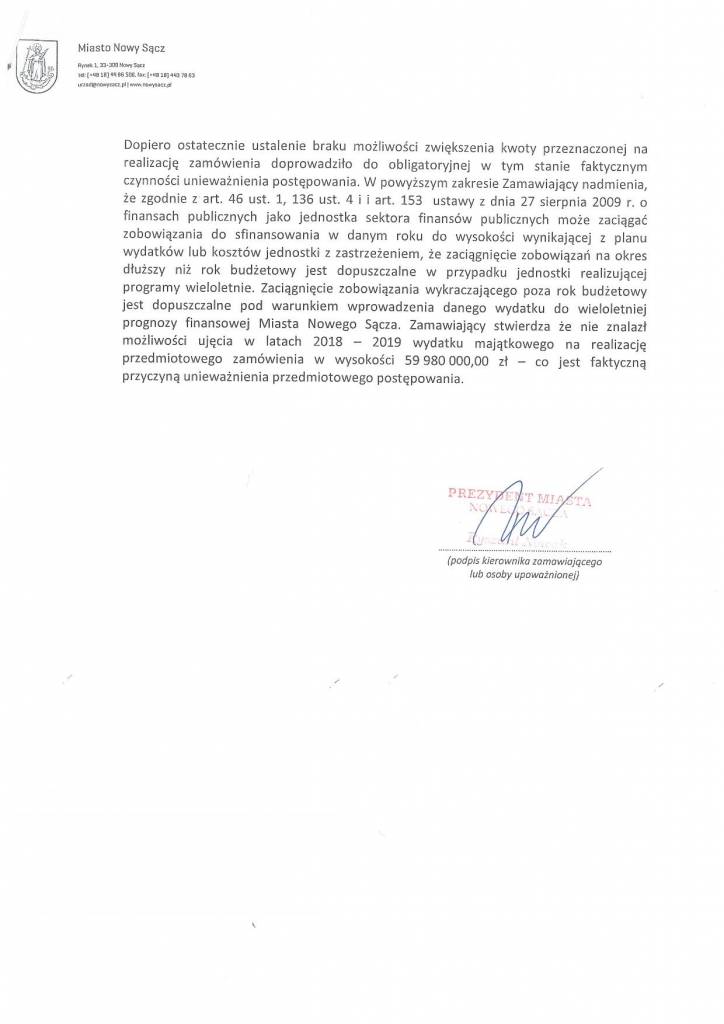 Przypomnijmy, że w ogłoszonym na początku października br. na „Przebudowę i rozbudowę Stadionu Miejskiego w Nowym Sączu przy ul. Kilińskiego 47 na działce nr 15/3 obr. 074 oraz części działek 13/5 obr. 074, 100/1 obr. 074, 101 obr. 074 wraz z wyposażeniem, infrastrukturą i zagospodarowaniem otoczenia obiektu” pojawiła się tylko jedna oferta. Niespełna 60 mln zł brutto zaproponowało konsorcjum firm ze Śląska z S-Sport z Katowic jako liderem.