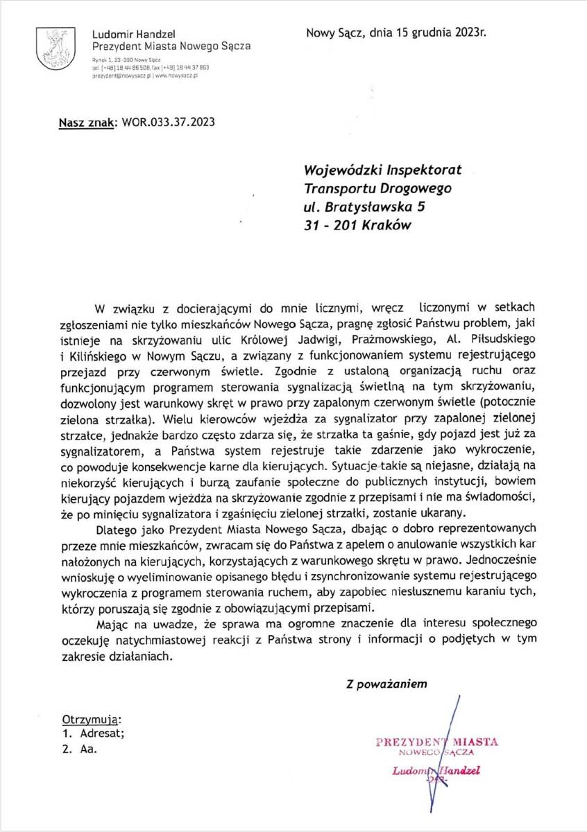 Już po publikacji naszego tekstu Szokująca liczba przejazdów na czerwonym świetle na Rondzie Solidarności prezydent Nowego Sącza Ludomir Handzel w mediach społecznościowych opublikował list, jaki w tej sprawie wysłał do Wojewódzkiego Inspektoratu Transportu Drogowego w Krakowie. Jego zdaniem opisywane mu przez wielu mieszkańców sytuacje karania za, w domniemaniu, prawidłowy przejazd przez rondo/skrzyżowanie, są niejasne i „burzą zaufanie społeczne do publicznych instytucji”. Prezydent apeluje o „anulowanie wszystkich kar nałożonych na kierujących, korzystających z warunkowego skrętu w prawo” oraz o wyeliminowanie błędnego, jego zdaniem, działania systemu i jego zsynchronizowanie z programem sterowania ruchem a także oczekuje „natychmiastowej reakcji”. Cały list poniżej: