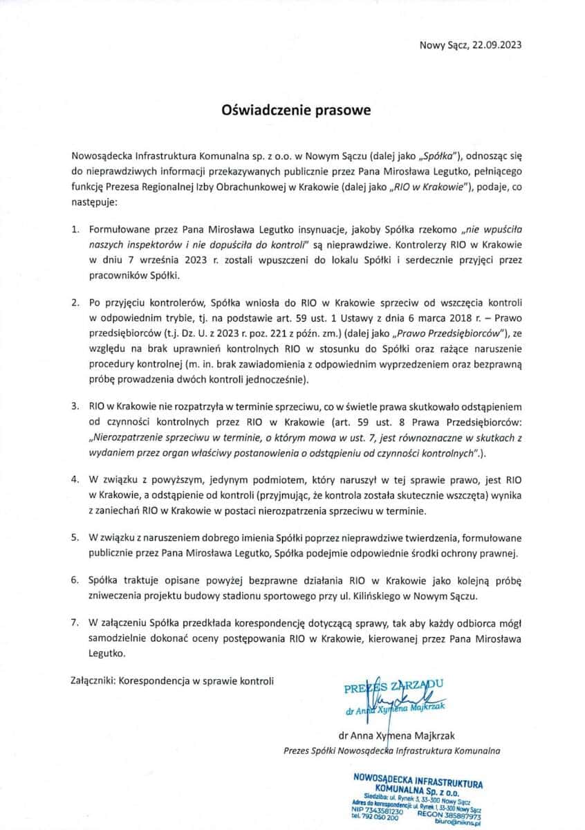 W piątek wieczór PAP uzupełniła doniesienia w tej sprawie: „Prezes Nowosądeckiej Infrastruktury Komunalnej Anna Xymena Majkrzak odpowiadając na pytanie PAP poinformowała, że w dniu próby kontroli, czyli 7 września zostało doręczono pismo do szefa krakowskiego RIO zawierające sprzeciw wobec kontroli z powołaniem się na Prawo przedsiębiorców, skutkujące wstrzymaniem czynności kontrolnych. Zdaniem prezes Nowosądeckiej Infrastruktury Komunalnej, RIO w Krakowie była zobowiązana rozpatrzyć tenże sprzeciw w terminie trzech dni roboczych”.