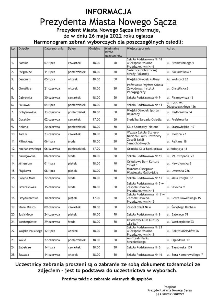 Zgodnie z Zarządzeniem nr 363/2022 Prezydenta Miasta Nowego Sącza z dnia 24 maja 2022 roku „w sprawie przeprowadzenia zebrań wyborczych na osiedlach w Nowym Sączu oraz wprowadzenia wzorów dokumentów wykorzystywanych w związku z wyborami do Zarządu Osiedla”, zebrania ogólne mieszkańców w celu wyborów Zarządu Osiedla odbędą się: