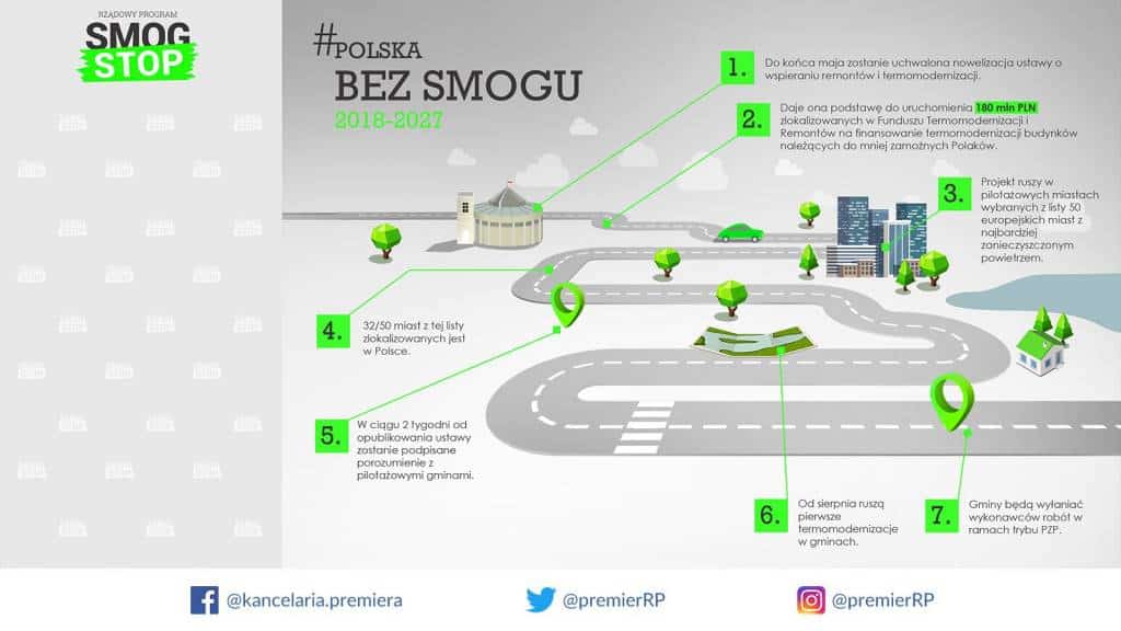 Rządowy program termomodernizacji zakłada wsparcie finansowe gospodarstw domowych o dochodach poniżej minimum socjalnego korzystających z paliw stałych dla potrzeb ogrzewania. Uruchomiony zostanie także program powszechnej termomodernizacji budynków mieszkalnych, który przewidywać będzie oddzielne instrumenty dla mniej i bardziej zamożnych gospodarstw domowych. Mniej zamożne gospodarstwa domowe w Polsce mogą liczyć na sfinansowanie ze środków publicznych 100% kosztów termomodernizacji ich budynków. Dla bardziej zamożnych Polaków wprowadzona zostanie możliwość skorzystania z preferencyjnych kredytów i pożyczek.