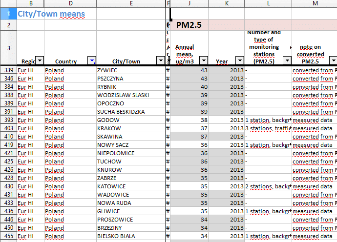 Według danych WHO 33 z 50 najbardziej zanieczyszczonych miast w UE leży w naszym kraju. Biorąc pod uwagę poziom zanieczyszczenia niezwykle szkodliwym dla naszych organizmów pyłem zawieszonym PM2,5, najwyższy roczny poziom stężenia odnotowany został w Żywcu, a następnie w Pszczynie oraz Dimitrovgradzie (Bułgaria). W tym zestawieniu Nowy Sącz znalazł się na 14. pozycji (m.in. za Krakowem i Varną w Bułgarii), ze średnim stężeniem PM2,5 w wysokości 36µg/m3 (dopuszczalny poziom średnioroczny to 25 µg/m³).