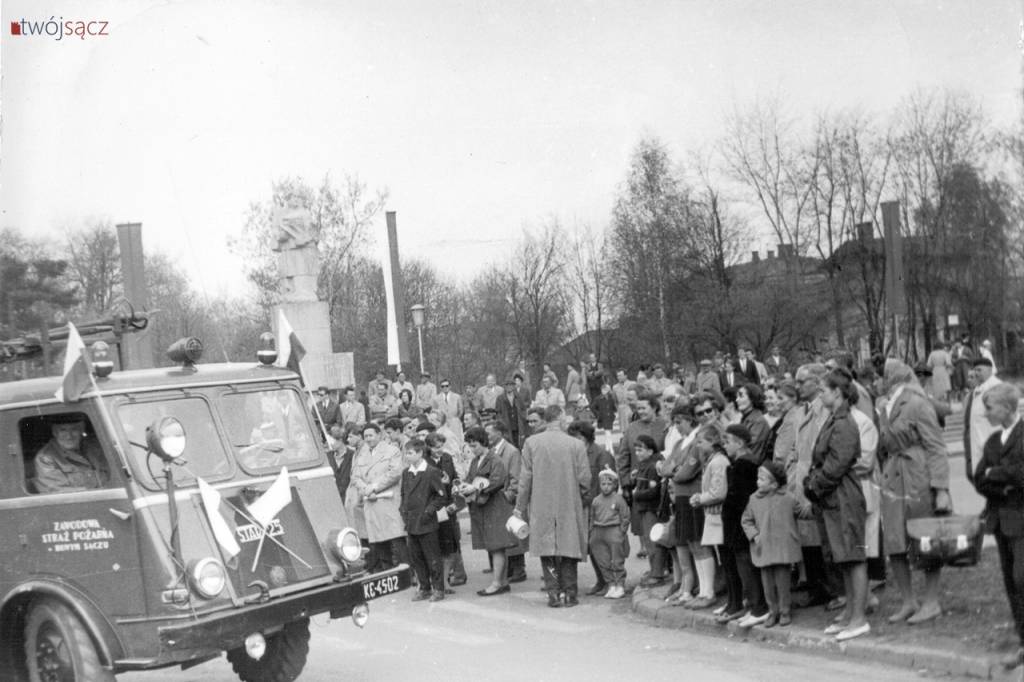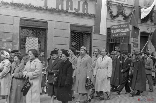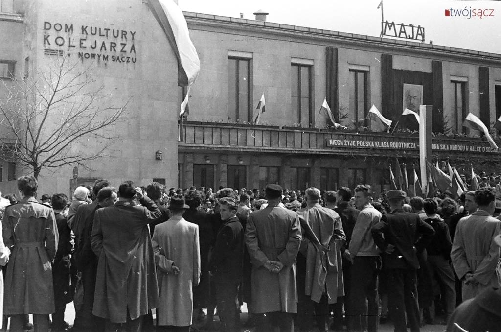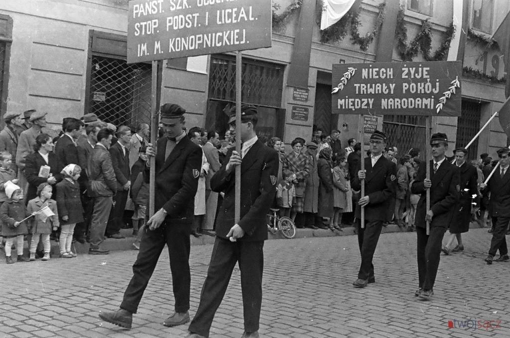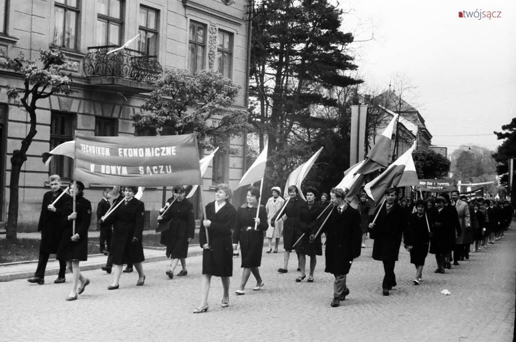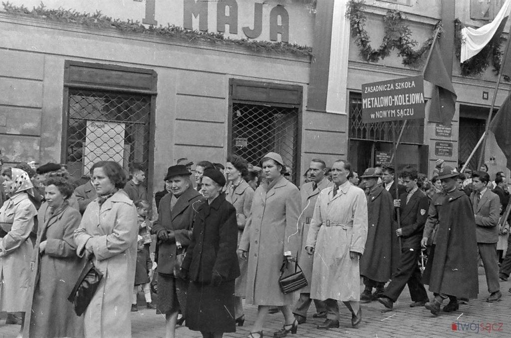 Nowosądeckie obchody 1 Maja nie różniły się specjalnie od tych w innych polskich miastach. „Spontaniczne” demonstracje maszerowały ulicami (przeważnie między Alejami Wolności a Rynkiem), niosąc flagi i czerwone szturmówki oraz transparenty z aktualnymi hasłami. Punktem kulminacyjnym (oprócz wysłuchania transmisji przemówienia przedstawiciela najwyższych władz) był przemarsz przed „trybuną honorową” i pozdrowienie zgromadzonych na niej przedstawicieli lokalnego aparatu władzy. Trybuny w czasie sądeckich pochodów stawiano pod ratuszem, na ul. Jagiellońskiej lub pod Domem Kultury Kolejarza (dziś MOK) na al. Wolności.