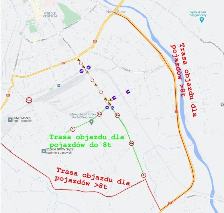Ulica Traugutta jest zamknięta od skrzyżowania z ul.Krokowskiego i ul. Żulińskiego. Z ul. Nawojowskiej można skręcić w ul. 29 Listopada (patrz mapka powyżej).