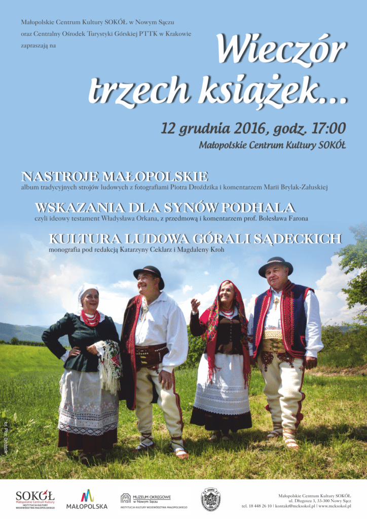 Małopolskie Centrum Kultury Sokół zaprasza w poniedziałek 12 grudnia na spotkanie promujące wydane niedawno trzy książki: „Nastroje małopolskie” Piotra Droździka i Marii Brylak-Załuskiej, „Wskazania dla synów Podhala” Władysława Orkana oraz „Kultura ludowa Górali Sądeckich” pod redakcją Katarzyny Ceklarz i Magdaleny Kroh.