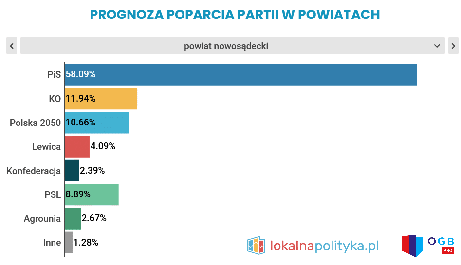 Według prognozy parlamentarnej przygotowanej przez serwis StanPolityki.pl schyłek wakacji to pierwsze miejsce Prawa i Sprawiedliwości z wynikiem 31,04% (spadek o 2,13 p.p.). Druga Koalicja Obywatelska notuje z kolei wzrost (o 0,71 p.p.) i może spodziewać się tym samym 26,95% poparcia. Z kolei trzecia Polska 2050 osiąga 18,84% (wzrost o 0,31 p.p.). Z kolei bliźniaczy serwis LokalnaPolityka.pl podaje sierpniowe prognozy poparcia partii politycznych w samym Nowym Sączu oraz w powiecie nowosądeckim – tu jak zwykle z dużą przewagą prowadzi PiS.