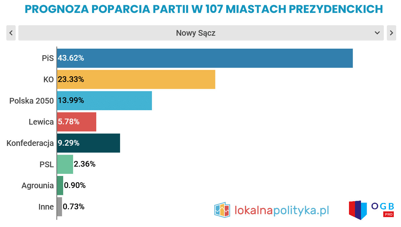 Z sierpniowego zestawienia bliźniaczego serwisu LokalnaPolityka.pl wynika, że w samym Nowym Sączu najwyższe poparcie ma, tradycyjnie, PiS.