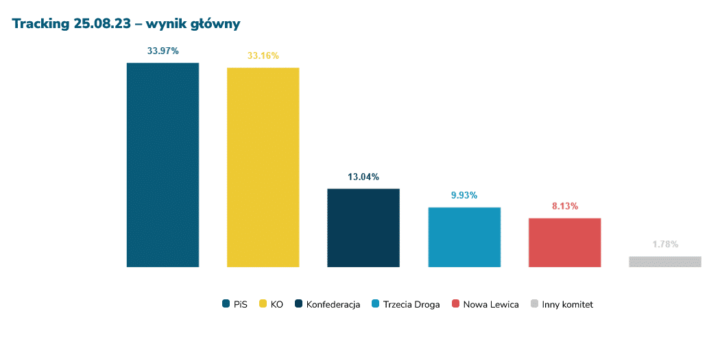 – 25 sierpnia 2023 r. największym poparciem cieszy się Prawo i Sprawiedliwość (33,97%) utrzymując przewagę nad Koalicją Obywatelską (33,16%). Na podium sympatii politycznych Polaków znajduje się jeszcze Konfederacja (13,04%), a za nią plasuje się Trzecia Droga. Ugrupowanie to jest popierane przez 9,93% Polaków gotowych pójść na wybory. Na piątej pozycji znajduje się Nowa Lewica z poparciem wynoszącym 8,13%. Inne komitety (np. Agrounia, Porozumienie, Kukiz’15) w czwartym tygodniu sierpnia mogą liczyć na poparcie rzędu 1,78% – podaje StanPolityki.pl.