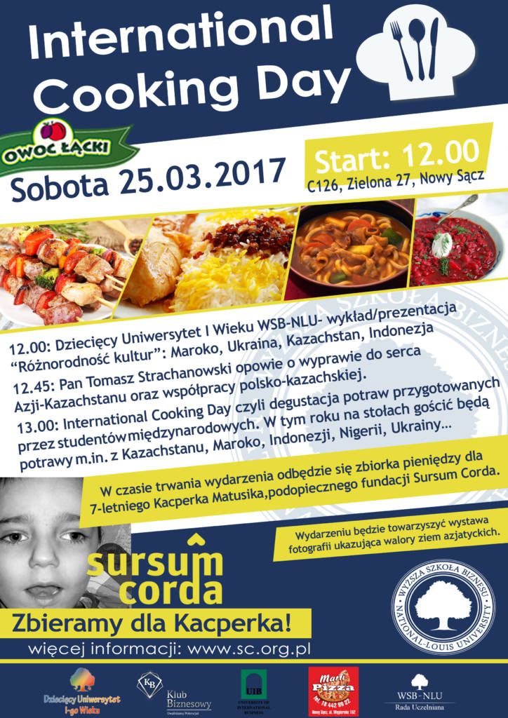 Wyższa Szkoła Biznesu – National Louis University serdecznie zaprasza do udziału w dniu kuchni międzynarodowej – International Cooking Day w sobotę 25 marca 2017 r. Polscy oraz zagraniczny studenci przygotowali specjalne wydarzenie na które zapraszają wszystkich chętnych. Jego celem jest charytatywna zbiórka pieniędzy dla chorego 7-letniego Kacperka Matusiaka.