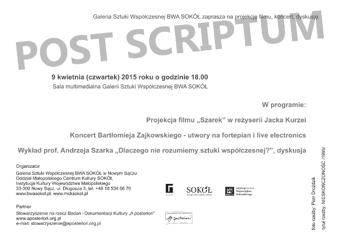 Wystawę prac Andrzeja Szarka w Galerii BWA SOKÓŁ można było oglądać od 28 listopada 2014 roku do 11 stycznia 2015 roku. Pierwsza od wielu lat tak duża prezentacja prac Artysty cieszyła się olbrzymią popularnością. Przygotowane wydarzenie jest jej uzupełnieniem, dopiskiem – post scriptum właśnie.