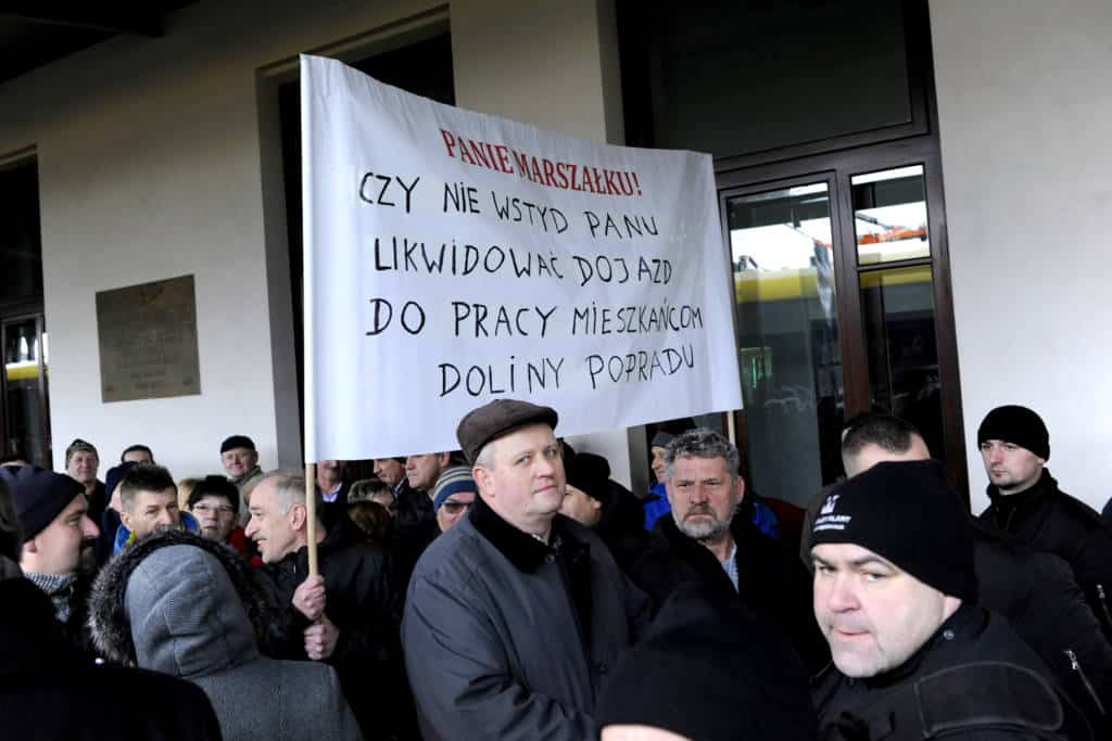 Jego przemówienie zakłócała grupka osób z transparentem „Panie Marszałku! Czy nie wstyd panu likwidować dojazd do pracy mieszkańcom Doliny Popradu”. Przedstawiciele Obywatelskiego Komitetu Obrony Połączeń Kolejowych na Sądecczyźnie domagali się rozmowy z członkiem zarządu województwa. Gdy podszedł do nich zarzucili, że władze Małopolski z jednej strony inwestują w nowe pociągi dla swojej „spółki wydmuszki” (według nich Koleje Małopolskie nie zatrudniają nawet maszynistów) a z drugiej strony połączenie nie są dogodne dla okolicznych mieszkańców, a pociągi nie zatrzymują się na małych stacjach. Zegzda próbował spierać się, że protestujący reprezentują interesy wyłącznie Przewozów Regionalnych a nie podróżnych a Koleje Małopolskie wożą w komfortowych warunkach, ale został zakrzyczany więc wycofał się uznając, że „taka rozmowa nie ma sensu”.