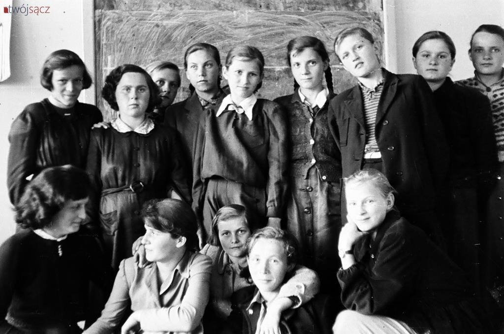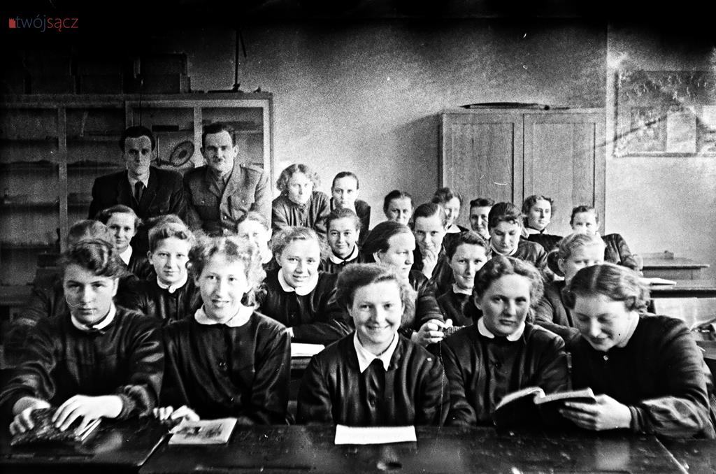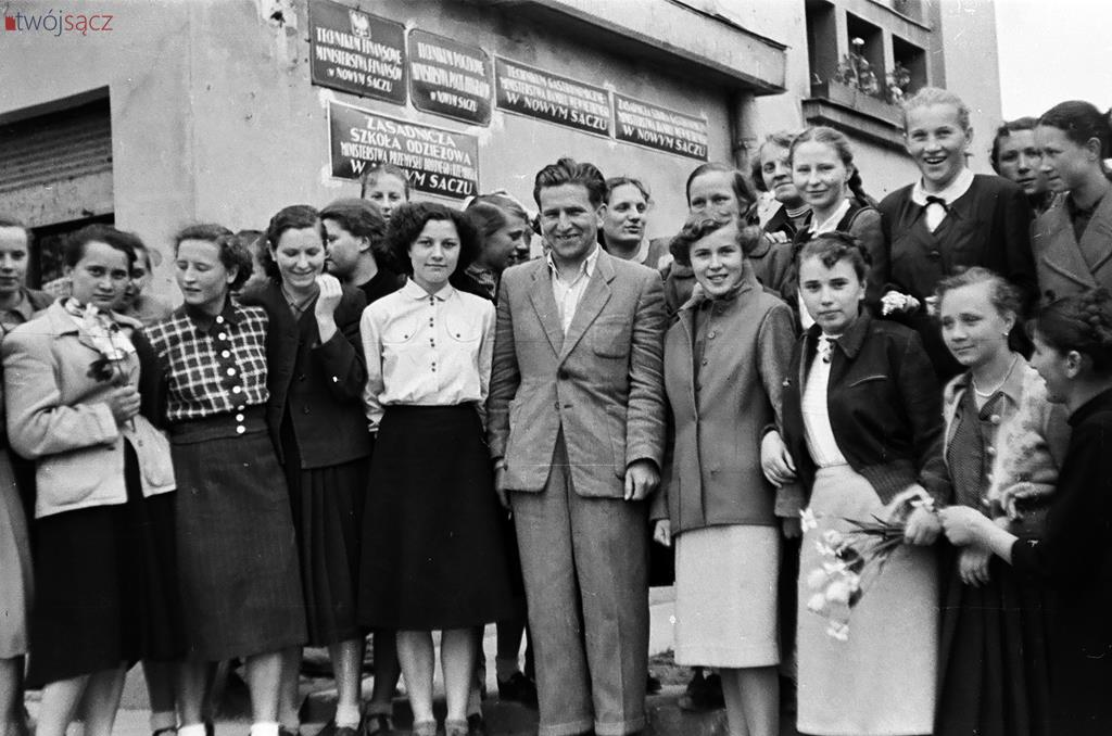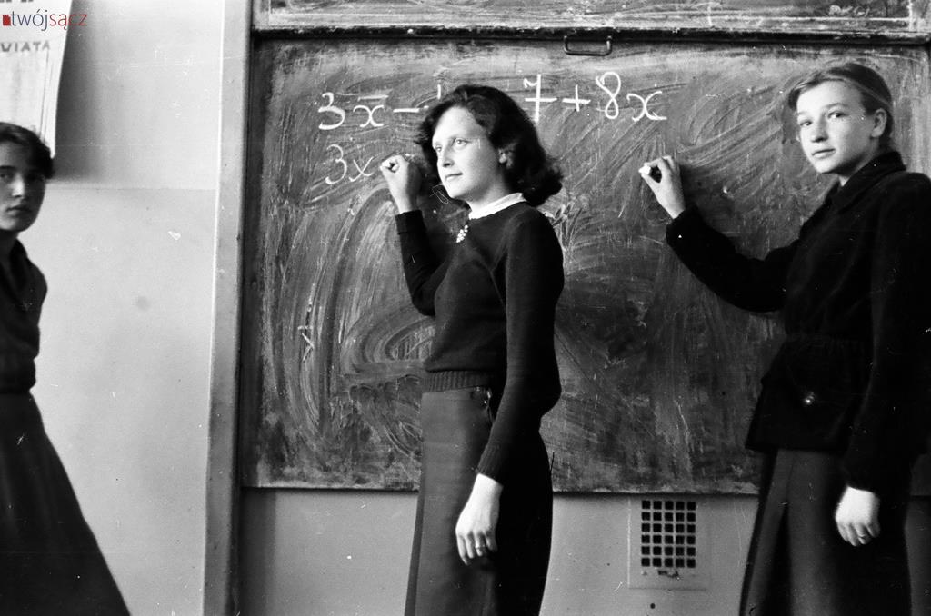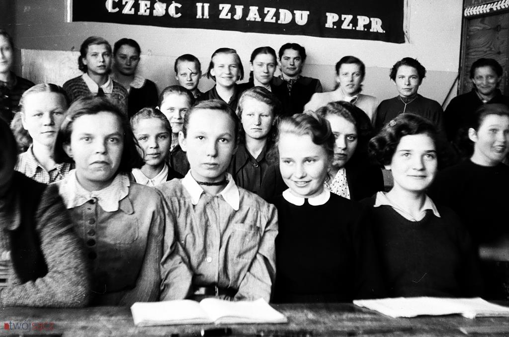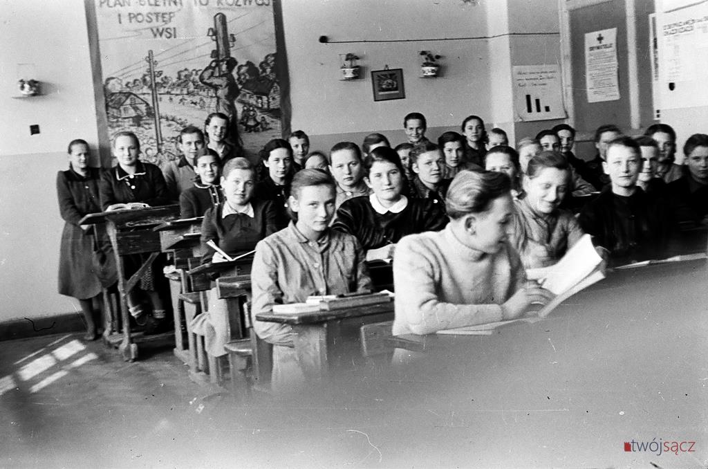 Uczniowie i nauczyciele z nowosądeckich szkół w latach 50. Bardzo wiele różni ubiór uczniów, wygląd ówczesnych klas czy ich wyposażenie od dzisiejszych. Diametralnie inne są też hasła na ścianach klas i korytarzy. Wspólne z dzisiejszymi są na pewno nieco beztroskie chwile z czasu młodzieńczej edukacji i częsty uśmiech na twarzach szkolnej młodzieży. Mimo, że w tamtych, ciężkich czasach wielu z uwiecznionych na tych zdjęciach być może straciło wszystkich bliskich w czasie zakończonej zaledwie kilka lat wcześniej wojnie… Być może chodzili głodni, nie mieli porządnych butów i nie znali pojęcia kieszonkowe. Ale to już temat na inną opowieść.