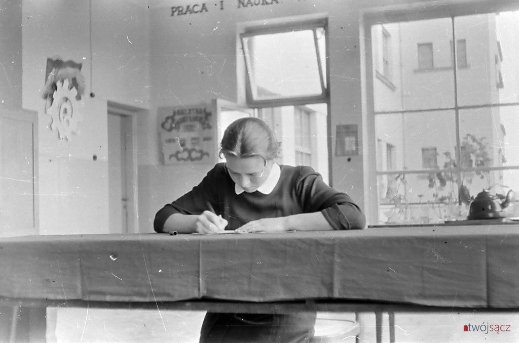 Zdjęcia, które Państwu prezentujemy prawdopodobnie nigdy wcześniej nie były pokazywane. Zostały zrobione przez nieznanych nam autorów między 1954 a 1959 rokiem. Pochodzą ze zbiorów redakcji serwisu Twój Sącz (odnalezionych po latach negatywów, albumów rodzinnych, odbitek podesłanych przez Czytelników etc.). Niektóre zostały zidentyfikowane – zarówno jeśli chodzi o miejsca, jak i osoby. Większość tutaj prezentowanych fotografii zostało zrobionych w szkole przy ul. Grodzkiej 34 (dziś Zespół Szkół Ekonomicznych) i jej otoczeniu – wtedy działało tu kilka różnych szkół ponadpodstawowych. Podobnie było przy ul. Jagiellońskiej 82-84 (gdzie też zrobiono niektóre zdjęcia). Pod koniec lat 50. działały w jednym budynku Technikum Samochodowe oraz Zasadnicza Szkoła Gastronomiczna.