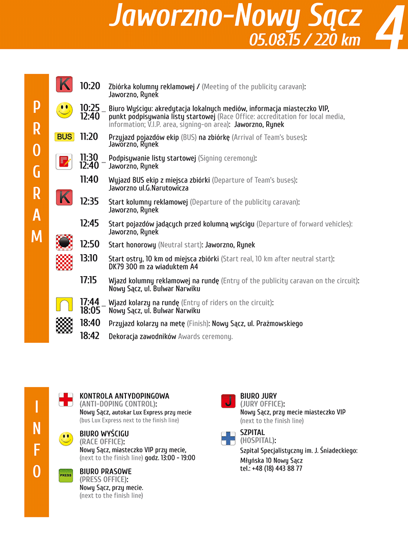 W Nowym Sączu metę na ulicy Prażmowskiego (przy CH Gołąbkowice) będzie miał 4. etap wyścigu z Jaworzna (tutaj wszelkie informacje o trasie, orientacyjnych czasach przejazdu i programie). Przed tym kolarze przejadą trzykrotnie przez miasto pętlą zaznaczoną na mapce. Wcześniej skróconą trasą po ulicach miasta będą jeździć młodzi kolarze w ramach Nutella Mini Tour de Pologne (patrz mapka, program znajdziesz tutaj). Po wytyczonej pętli przejedzie również kolumna reklamowa sponsorów wyścigu. Organizatorzy apelują, żeby widzowie, których spodziewają się tysiące, zachowali ostrożność a w szczególności pilnowali dzieci. Radzą także mieszkańcom pozostawienie psów w domach lub bezwzględne wyprowadzanie ich na smyczy.