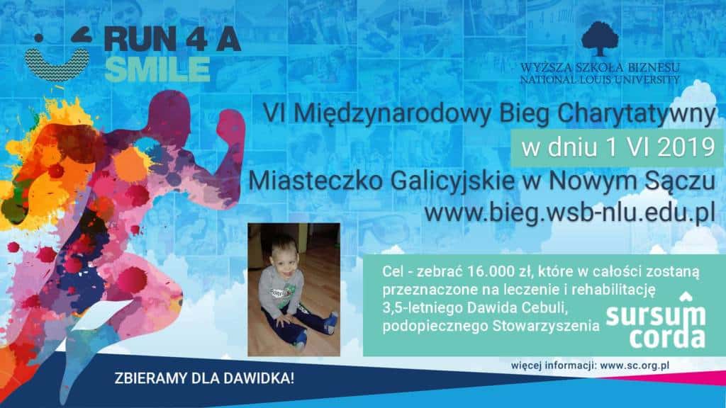 VI Międzynarodowy Bieg po uśmiech, Run 4 a Smile odbędzie się 1 czerwca 2019r, tradycyjnie w Miasteczku Galicyjskim. To już szósta edycja projektu, przygotowywana przez międzynarodową grupę studentów WSB-NLU, przy wsparciu wielu partnerów. W ubiegłych latach uczestnicy biegli między innymi po uśmiech Kacperka Matusika, Piotrusia Bajdela, Faustynki Pajor oraz Patryka Mrowca oraz wsparli ogólnokrajową akcję Kilometry Dobra. Event cieszy się coraz większą popularnością, o czym świadczy rosnąca z roku na rok liczba uczestników, jak również kwota zebranych funduszy, przeznaczanych corocznie w całości na cele charytatywne.