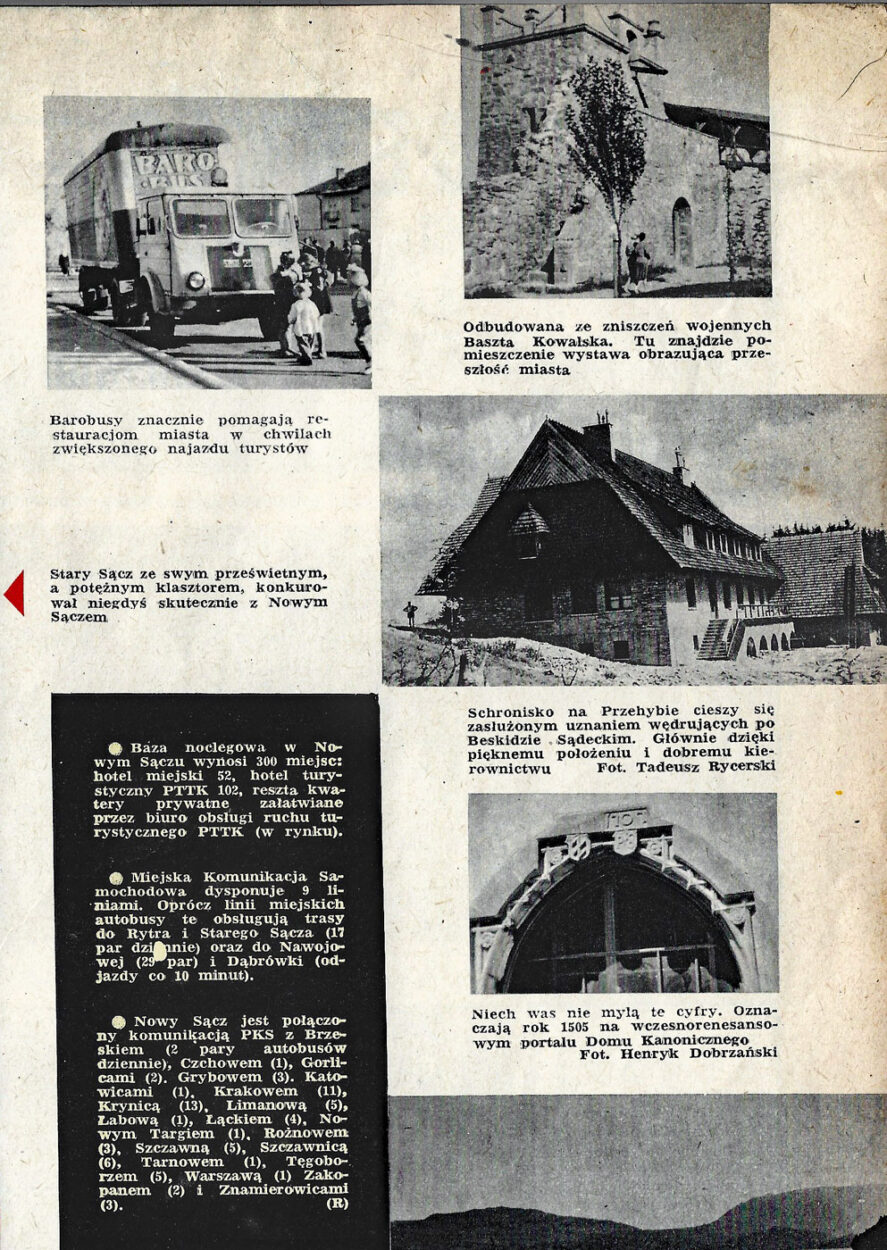 Rety, ludzie, co się dzieje! Mam wobec tego propozycję do Pana Ministra Lesza. Może by tak, póki rok gastronomiczny trwa jeszcze, posłać paru kelnerów i speców z Warszawy, Zakopanego i innych miast do Nowego Sącza. Niech się przypatrzą, nauczą uprzejmości i dobrej obsługi. Z obsługą w Sączu, zwłaszcza turysty, jest w ogóle dobrze. Jest chyba dobrze dlatego, że istnieje ścisła współpraca między gospodarzem miasta Miejską Radą Narodową a biurem obsługi ruchu turystycznego PTTK, które skomasowało w swych rękach wszelkiego rodzaju usługi: organizowanie wycieczek i przedsprzedaż biletów PKS, kinowych, teatralnych, sprzedaż wydawnictw turystycznych, pamiątek regionalnych, ba! nawet nalepek z sylwetą miasta„.