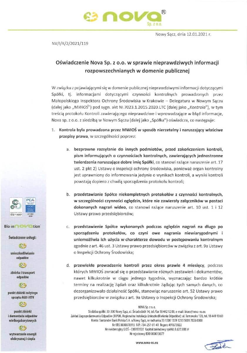 Tymczasem zarząd spółki Nova wystosował już oświadczenie “w sprawie nieprawdziwych informacji rozpowszechnianych w domenie publicznej” w którym stwierdza, że “kontrola była prowadzona przez MWIOŚ w sposób nierzetelny i naruszający właściwe przepisy prawa”. Poniżej pełna treść oświadczenia: