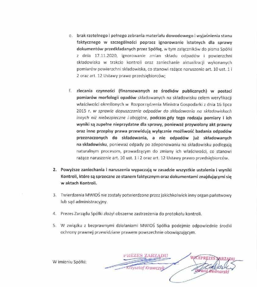 Kontrola stwierdziła naruszenie przestrzegania przepisów prawa m.in. poprzez “prowadzenie składowiska w sposób niezgodny z pozwoleniem zintegrowanym i z instrukcją eksploatacji składowiska – poprzez niewłaściwy nadzór nad rodzajem przyjmowanych odpadów”; składowanie odpadów poza czaszą składowiska czyli bez wymaganego pozwolenia; unieszkodliwianie na składowisku odpadów, które posiadają właściwości niebezpieczne. W podsumowaniu kontroli mowa też o niewłaściwym magazynowaniu odpadów biodegradowalnych, nieprawidłowościach przy składowaniu odpadów wielkogabarytowych, braku pozwolenia wodnoprawnego na odprowadzanie części wód opadowych, nierzetelne oraz niezgodne ze stanem rzeczywistym prowadzenie ewidencji części odpadów.