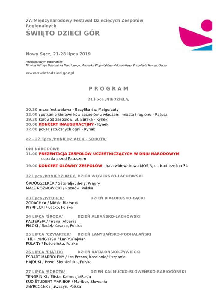 27. Międzynarodowy Festiwal Dziecięcych Zespołów Regionalnych Święto Dzieci Gór odbędzie się w Nowym Sączu między 21 a 28 lipca 2019 r. Do udziału w tegorocznym Festiwalu zaproszono zespoły z: Albanii, Białorusi, Kałmucji, Katalonii, Słowenii, Tajwanu i Węgier. Towarzyszyć im będą polskie dziecięce zespoły regionalne, reprezentujące folklor: babiogórski, lachowski (Lachy Sądeckie i Lachy Szczyrzyckie), łącki, podhalański oraz żywiecki.