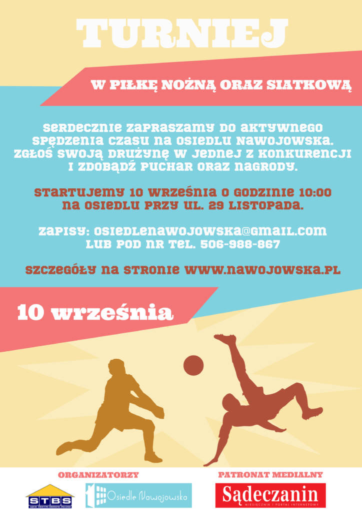 Koniec lata nie oznacza, że możemy przygotowywać się do zimowego snu i zapomnieć o aktywności fizycznej. Dlatego chcielibyśmy zaprosić mieszkańców do udziału w turnieju piłki nożnej oraz siatkowej na osiedlu Nawojowska, który odbędzie się 10 września. Organizatorzy, czyli Zarząd Osiedla Nawojowska oraz Sądeckie Towarzystwo Budownictwa Społecznego zapraszają do wspólnej zabawy i sportowej rywalizacji wszystkich mieszkańców naszego regionu.