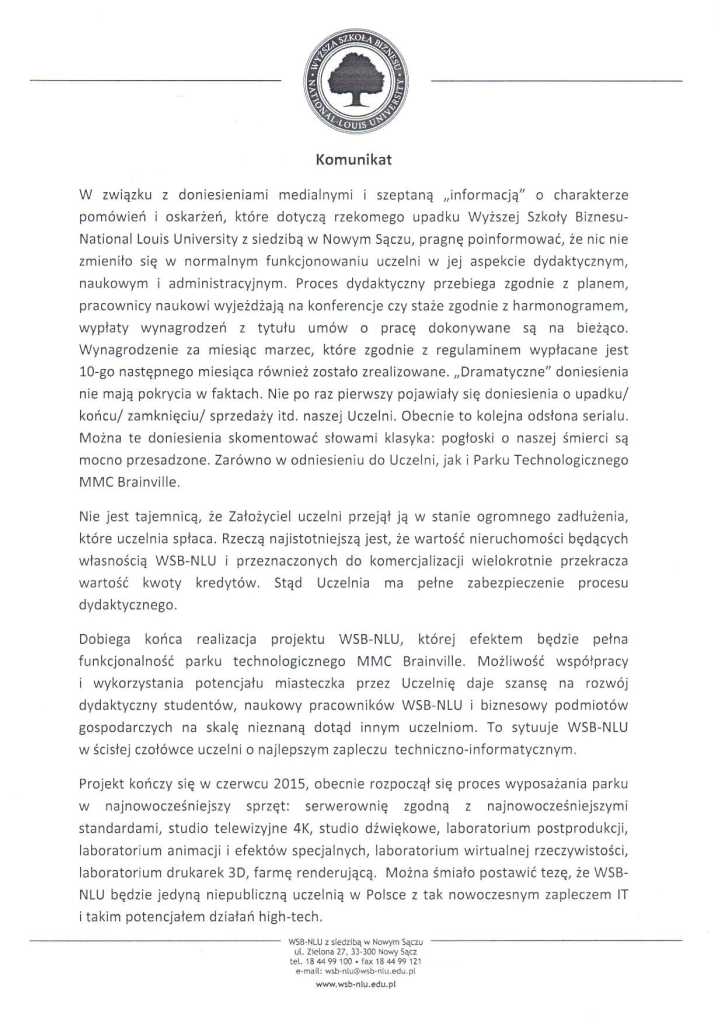 Wyższa Szkoła Biznesu – National Louis University wydała komunikat w którym dementuje „doniesienia medialne i szeptaną „informację” o charakterze pomówień i oskarżeń, które dotyczą upadku” szkoły.