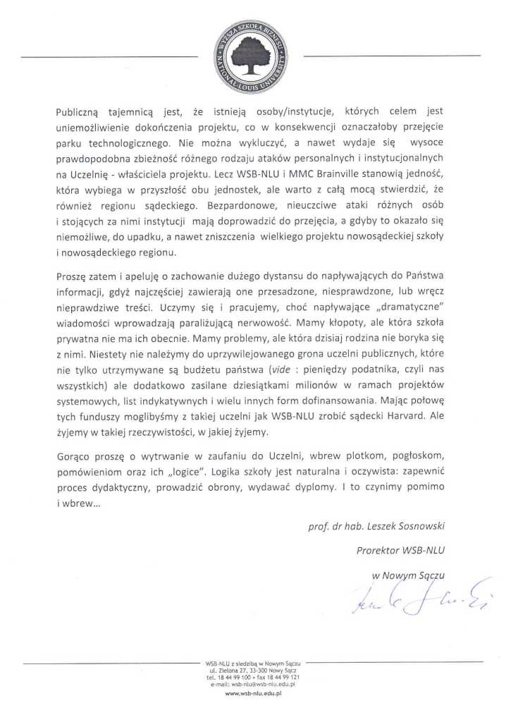 Prorektor Sosnowski odnosi się także do informacji o trudnej sytuacji Parku Technologicznego MMC Brainville który był pomysłem szkoły i w połowie należy do niej (druga część jest w rękach inwestora prywatnego, skłóconego z obecnym zarządem). Termin zakończenia projektu był przesuwany już kilkakrotnie, majątek Miasteczka jest objęty nadzorem sądowym, choć obecnie trwa postępowanie wyłaniające dostawcę specjalistycznego wyposażenia o wartości 13 mln zł (o kłopotach MMC Brainville piszemy tutaj).