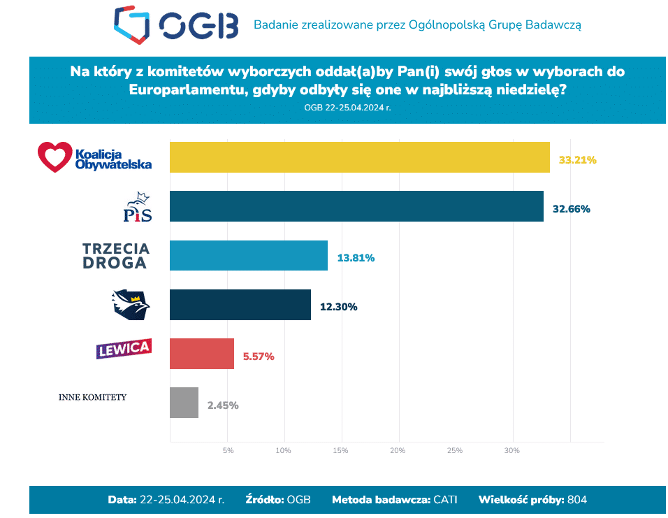 Według najnowszego sondażu Ogólnopolskiej Grupy Badawczej, gdyby wybory do Parlamentu Europejskiego odbyły się w minioną niedzielę, na Koalicję Obywatelską zagłosowałoby 33,21% wyborców, co oznacza wzrost względem wyniku Koalicji Europejskiej z 2019 roku o 0,73 p.p. Na drugim miejscu znalazłoby się Prawo i Sprawiedliwość z poparciem 32,66%, czyli większym o 2,68 p.p. niż partia ta uzyskała podczas ostatniego głosowania. Tym samym różnica między dwoma największymi partiami w Polsce w wyborach europarlamentarnych wynosi 0,55 p.p. Na trzecim miejscu z wynikiem 13,81% znalazłaby się Trzecia Droga. Konfederacja uzyskałaby 12,30% poparcia (wzrost o 3,50%). Swoich europosłów wprowadziłaby jeszcze Nowa Lewica, na którą zagłosowałoby 5,57% wyborców, a pozostałe ugrupowanie łącznie zdobyłyby poparcie na poziomie 2,45%.