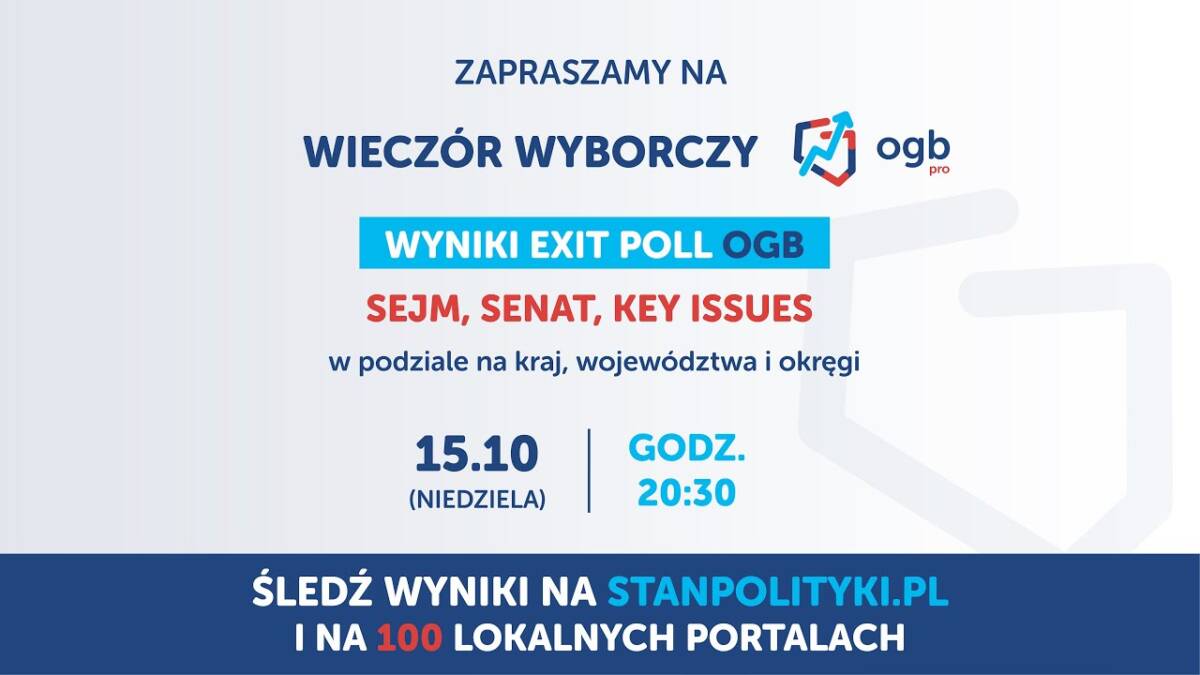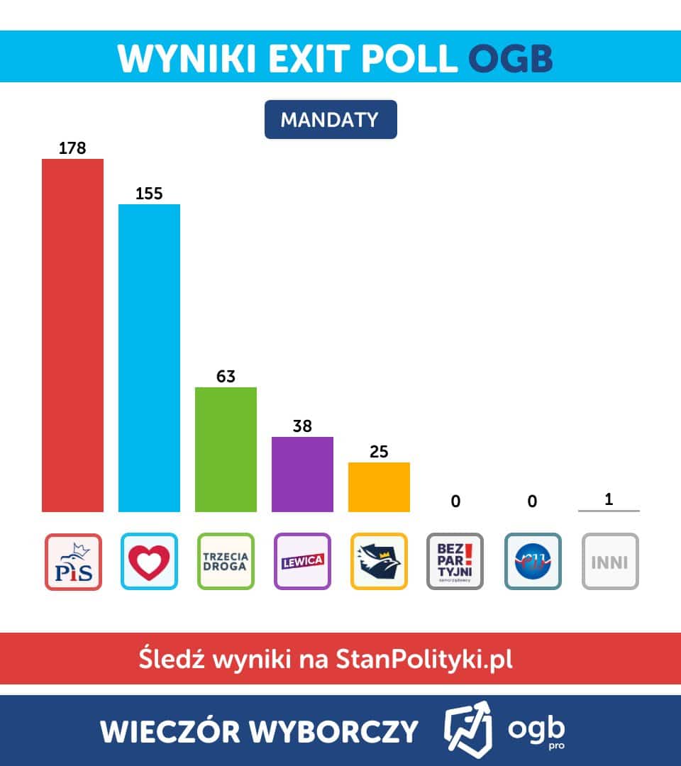 Exit Poll OGB: PiS zdobył 178 miejsc w Sejmie, Koalicja Obywatelska 155, Trzecia Droga 63, Lewica 38, Konfederacja 25.