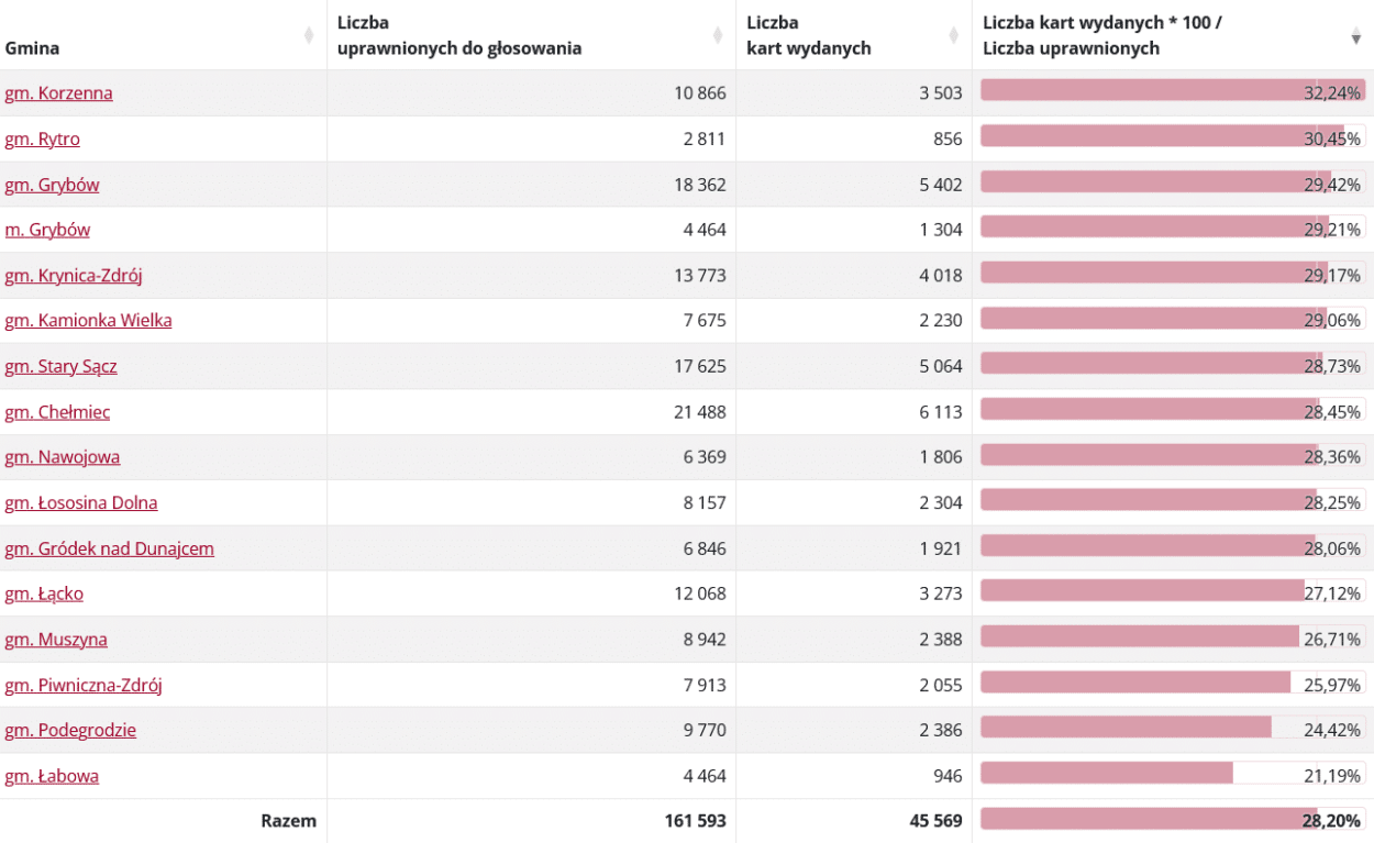 18:47 W gminach powiatu nowosądeckiego najwyższa frekwencja do godz. 17:00 była w gminie Grybów (66,72%), gminie Kamionka Wielka (66,29%) oraz gminie Korzenna (65,38%). Najniższa – 55,37% – była w gminie Piwniczna-Zdrój. Poniżej frekwencja na godz. 17:00 w powiecie nowosądeckim: