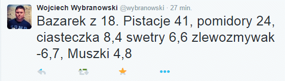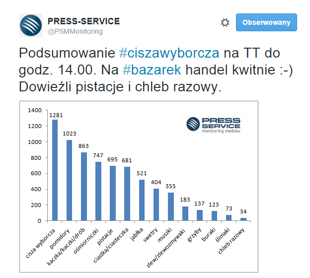 14:46 Twitter jak zwykle nie do końca przejmuje się niedzisiejszymi przepisami i na bieżąco komentuje szanse i notowania z tym, że pod nieco zmodyfikowanymi nazwami ugrupowań pod wspólnym hasłem #bazarek Zestawienie wykonane przez Press-Service Monitornig Mediów pokazujące ilość wzmianek na Twitterze (do godz. 14) dotyczących poszczególnych „towarów” z bazarku