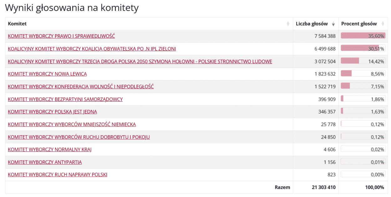 23:53 Do poznania pełnych wyników wyborów brakuje już niewiele. Dane PKW z 31 332 na 31 497 (99,48%) obwodów głosowania: PiS 35,60%, KO 30,51%, Trzecia Droga 14,42%, Konfederacja 7,15%