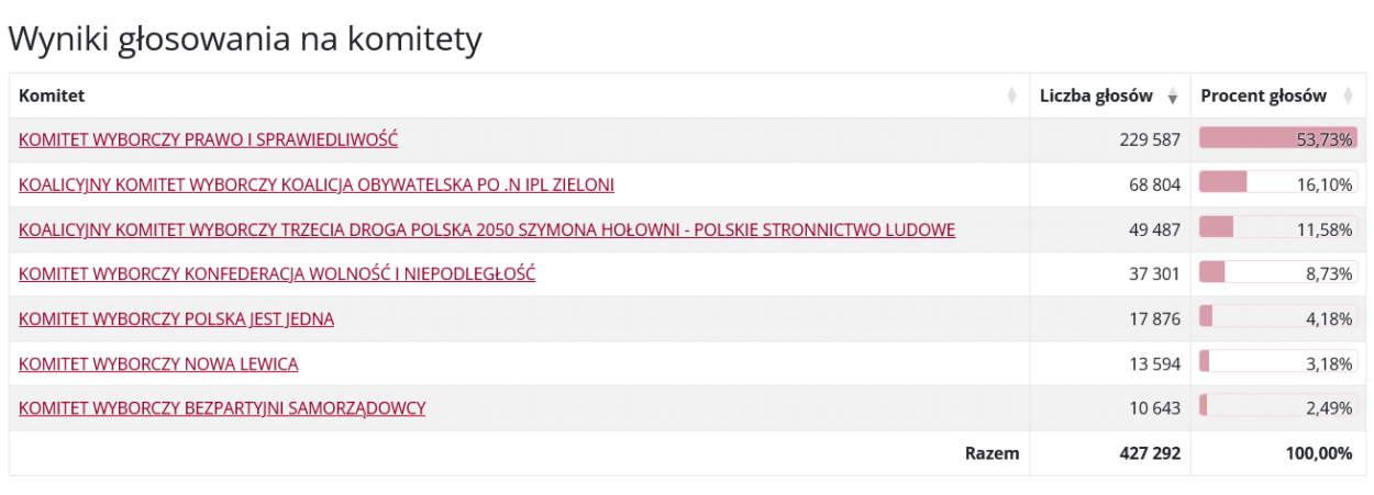 6 mandatów otrzymuje Prawo i Sprawiedliwość, 2 Koalicja Obywatelska, 1 Trzecia Droga PSL-PL2050 Szymona Hołowni oraz 1 Konfederacja Wolność i Niepodległość