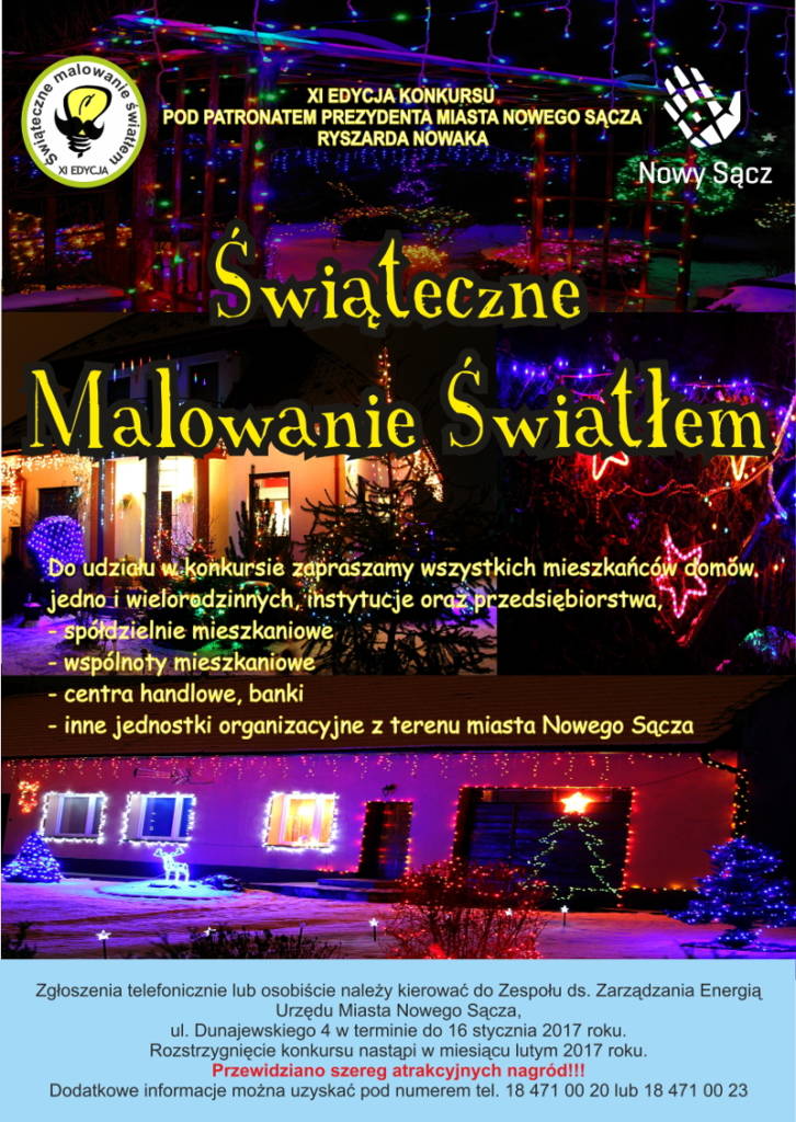 Do konkursu mogą zostać zgłoszone obiekty będące własnością miasta, prywatne posesje, instytucje, przedsiębiorstwa, spółdzielnie mieszkaniowe, wspólnoty mieszkaniowe, centra handlowe, banki i inne jednostki z terenu miasta. Zwycięzcy otrzymają tytuł „Najładniejszej iluminacji świątecznej 2016” oraz nagrody rzeczowe.
