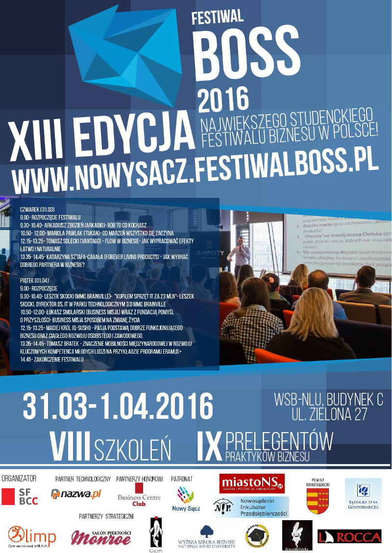 Na terenie Kampusu WSB-NLU w dniu 31.03 – 01.04.2016 r. odbędzie się XIII edycja Festiwalu BOSS. Impreza została zorganizowana przez sądeckich studentów, a wstęp na nią jest całkowicie darmowy.